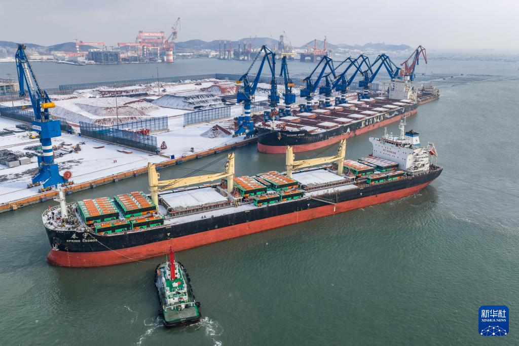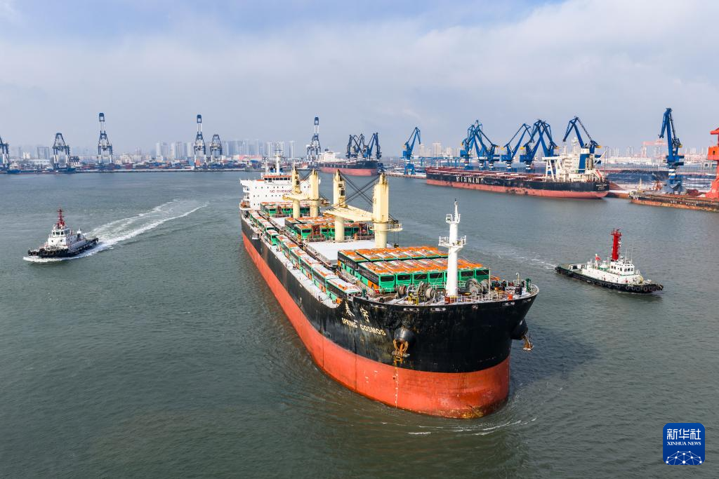 2月7日,装载着出口墨西哥的天然气公交车的货轮从山东港口烟台港起航(无人机照片)。