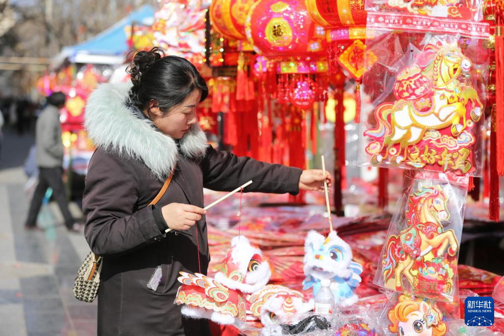 2月7日,人们在甘肃省定西市安定区年货市场选购春节饰品。