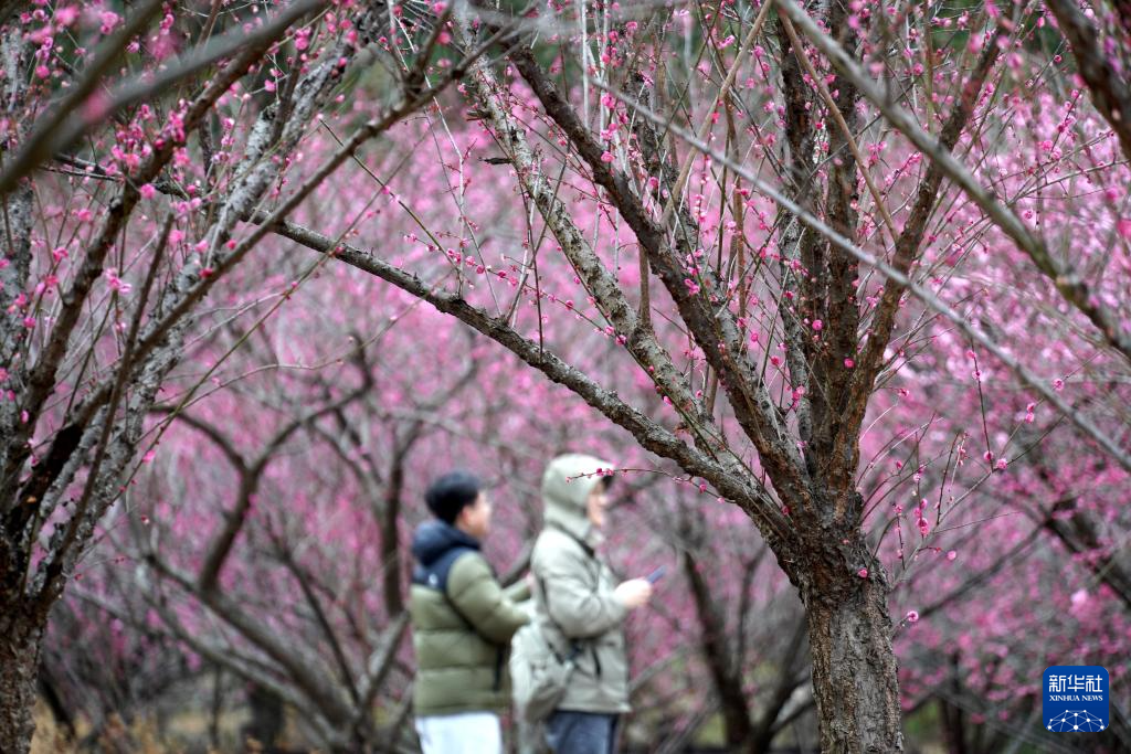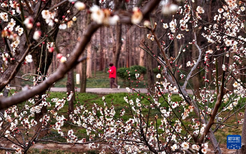 2月4日,市民在河南省洛阳市隋唐城遗址植物园游园赏花。