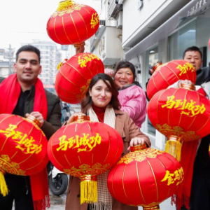 2月10日,在江苏省淮安市淮阴区营中社区,淮阴师范学院留学生和社区居民一起挂灯笼。