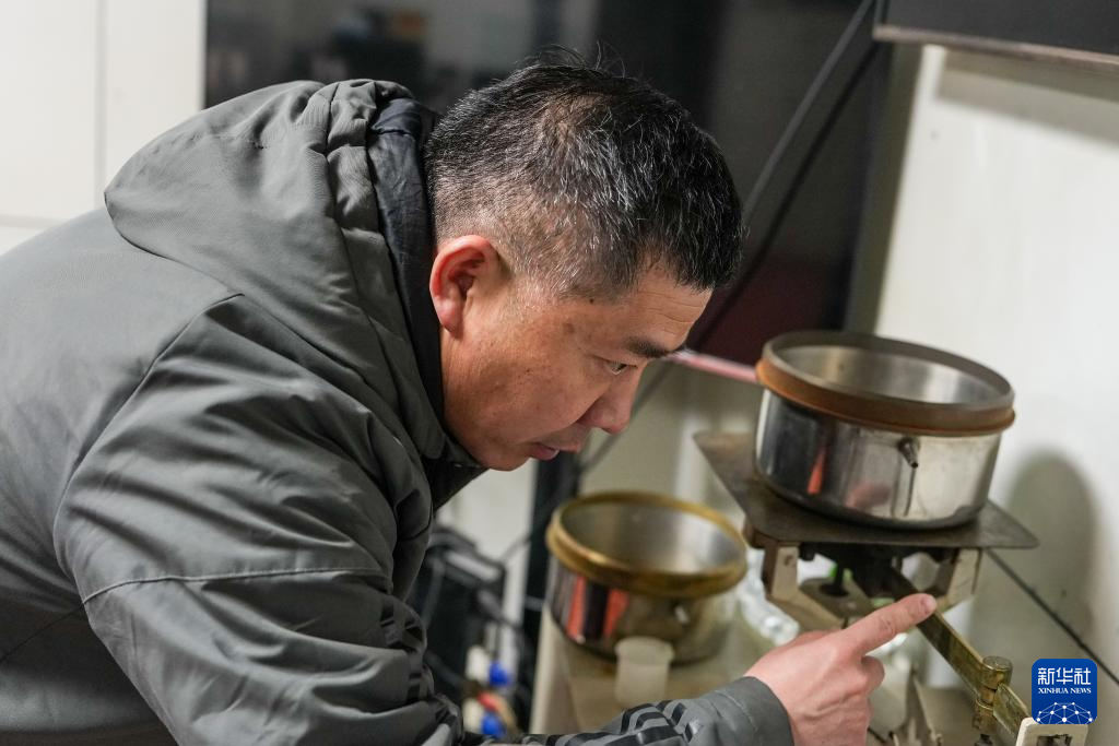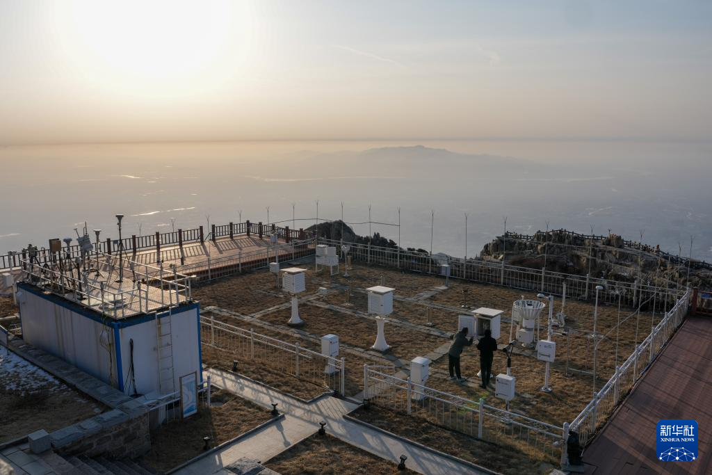 2月7日,观测员在泰山气象站观测场内检查仪器设备。