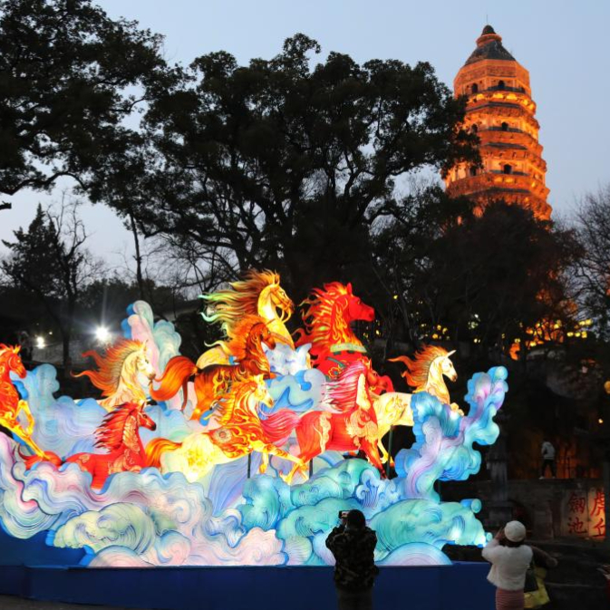 2月11日,2026年苏州虎丘山灯会正式亮灯迎客,游客赏灯拍照。