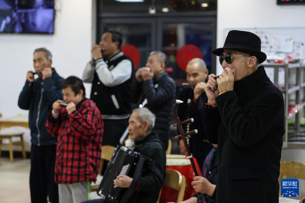 2月10日,养老院的老人在联欢会上演奏乐曲。
