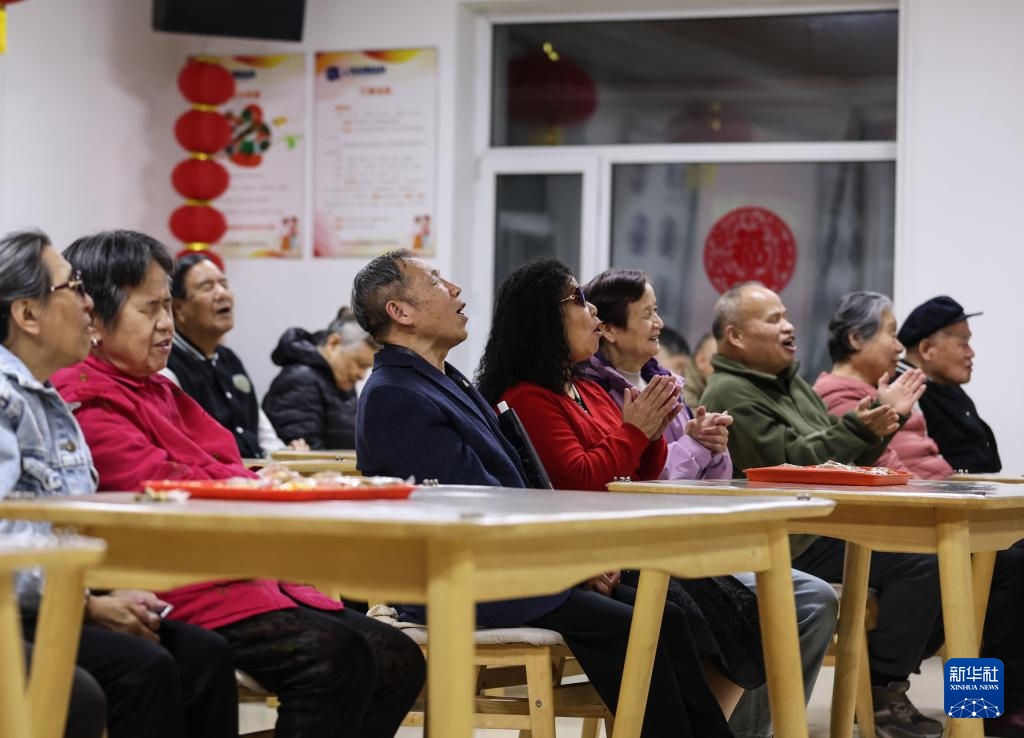 2月10日,养老院的老人在联欢会上演唱歌曲。