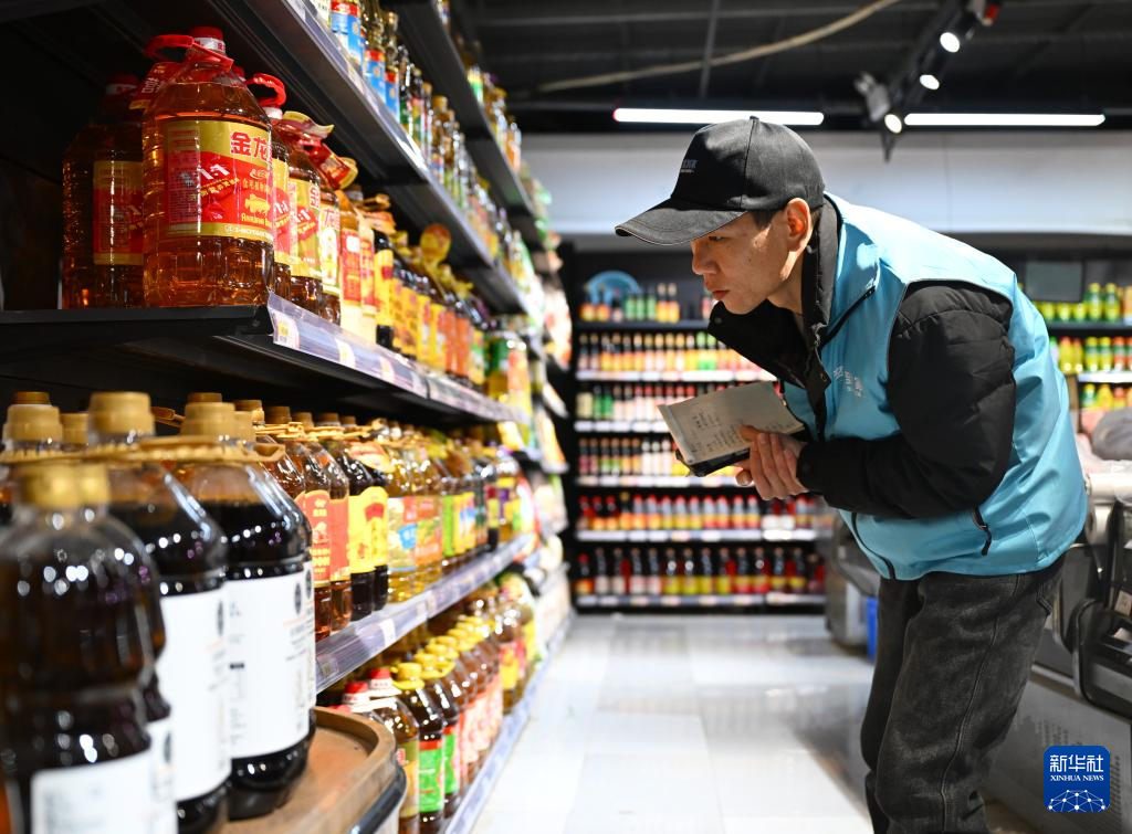 2月9日,在河南省周口市鹿邑县玄武镇一家超市内,马高杰在采购商品。