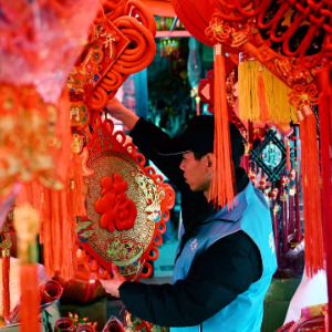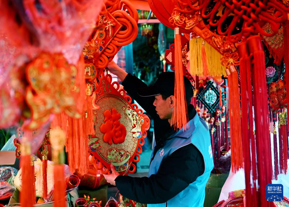 2月10日,在河南省周口市鹿邑县玄武镇,马高杰在挑选挂饰。