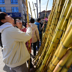 2月13日,游客在焦岱大集上选购甘蔗。