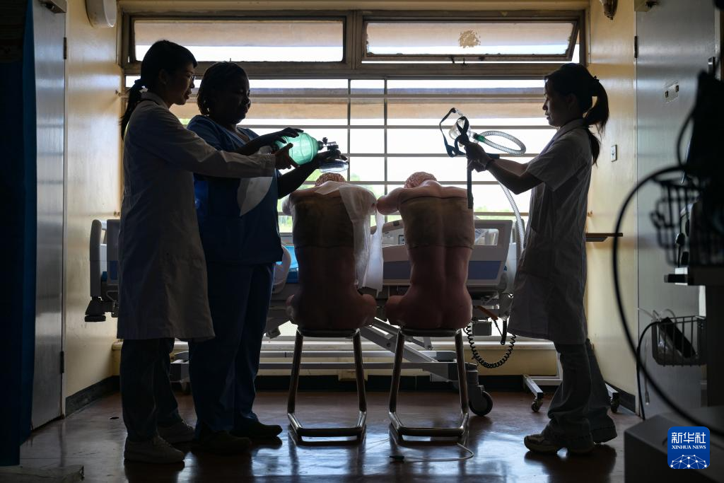 1月29日,在津巴布韦首都哈拉雷的帕里雷尼亚图瓦医院呼吸与危重症科临床技能培训中心,第22批中国援津医疗队队员为一名津巴布韦护士培训急救技能。