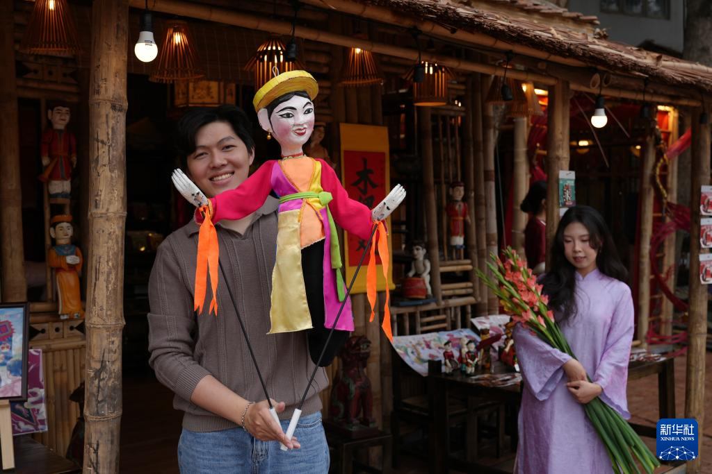 2月12日,在越南首都河内的新春书法节现场,工作人员操作木偶欢迎往来游客。
