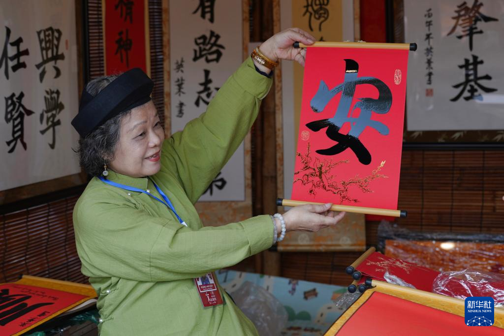 2月12日,在越南首都河内的新春书法节现场,一名书法家展示汉字书法作品。