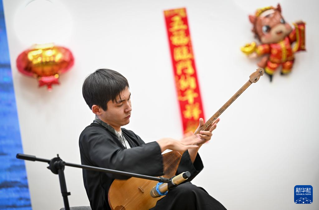 2月13日,在位于阿拉木图的哈萨克斯坦法拉比国立大学,孔子学院学生在新春晚会上弹奏冬不拉。