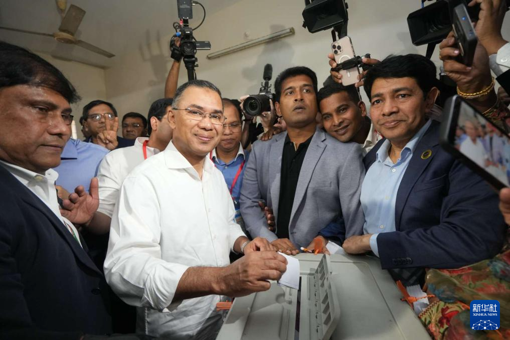 2月12日,在孟加拉国首都达卡一处投票站,孟加拉国民族主义党主席、前总理卡莉达·齐亚之子塔里克·拉赫曼(中)参加投票。
