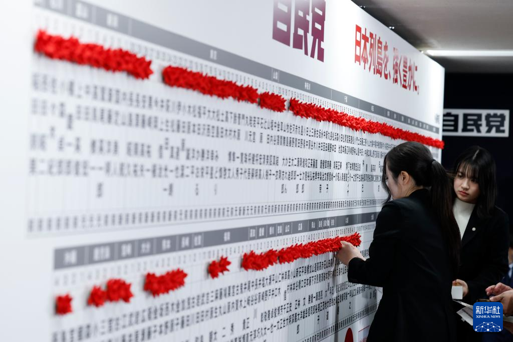 2月8日,在日本东京的自民党总部,工作人员将象征成功当选的红花贴在候选人名字上。