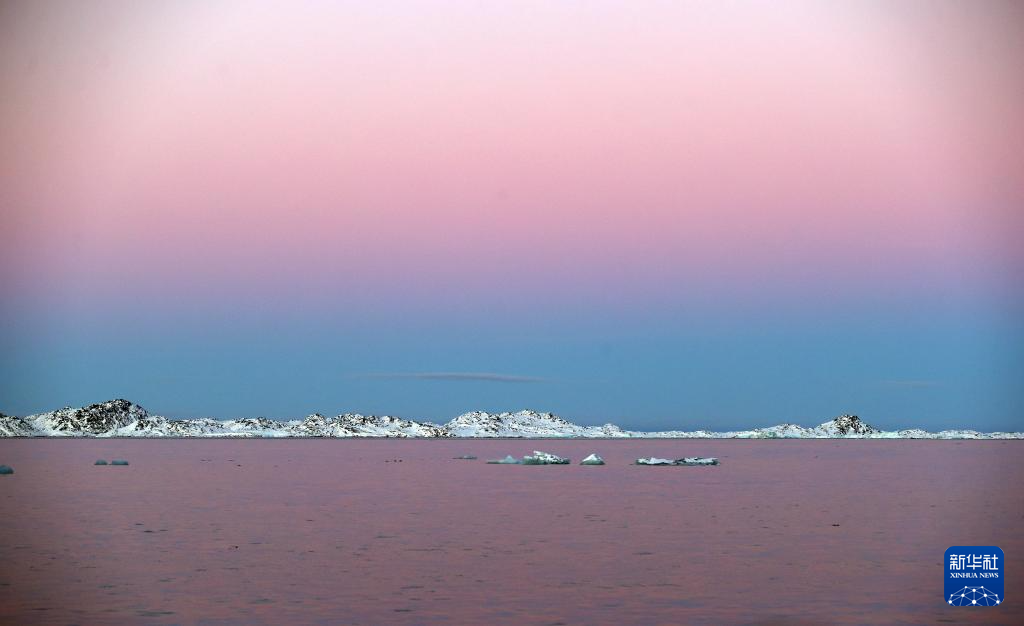 这是2月8日在丹麦自治领地格陵兰岛首府努克附近拍摄的日出时分景色。