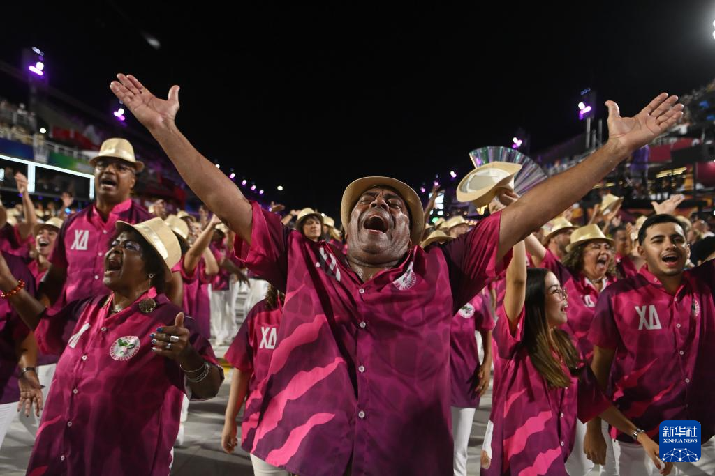 2月13日,一家桑巴学校的成员参加在巴西里约热内卢举行的2026年狂欢节游行。