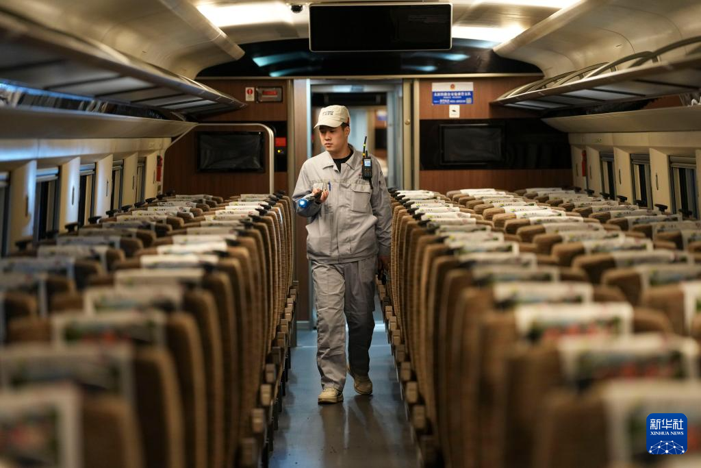 在太原动车组运用所检修库,鄂明在车厢内巡检(2月13日摄)。