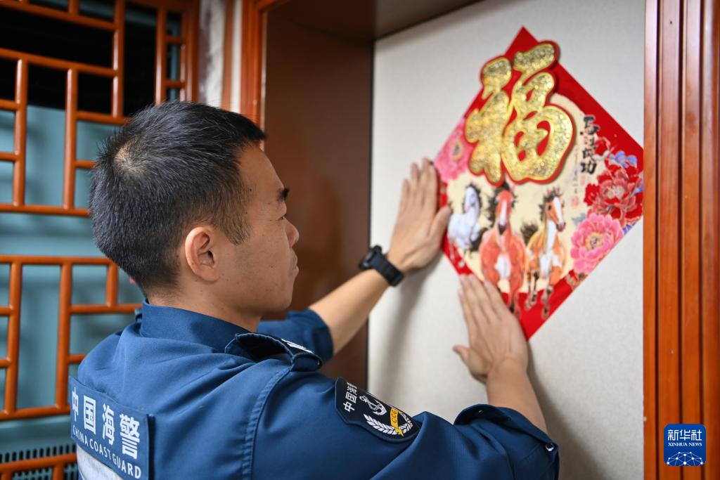 2月11日,中国海警万山舰执法员张胜峰在贴福字。这是他从事海警工作的第15年,也是他在海上度过的第4个春节。