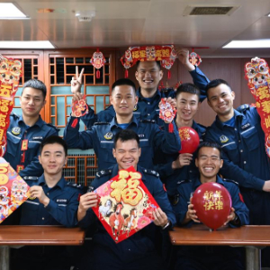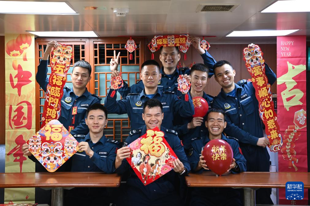 中国海警万山舰编队是农历马年首支在黄岩岛海域执行维权执法任务的海警编队,海警执法员们将在海上度过马年春节。“舰艇迎春破浪去,平安守岁载歌还”,坚守岗位的海警执法员们对新的一年满怀憧憬和祝福,祝福伟大祖国繁荣昌盛,祝愿所有家庭幸福美满。