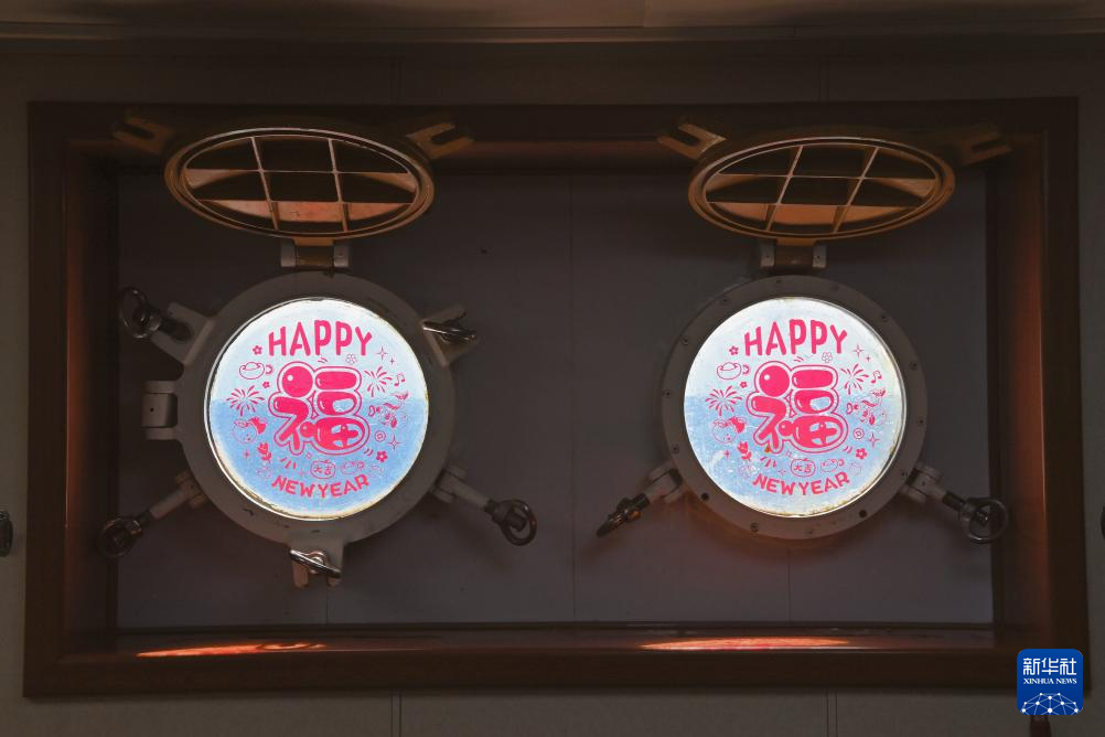 这是2月11日拍摄的中国海警万山舰舷窗上的新年窗花。