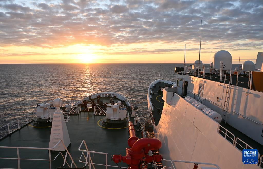 1月26日,中国海警万山舰(左)与东沙舰并靠后漂泊在黄岩岛附近海域。当日,中国海警万山舰编队抵达黄岩岛附近海域,与海警东沙舰编队开展任务交接。