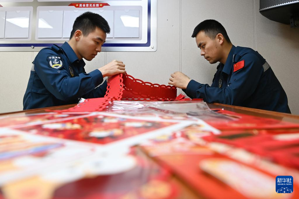 2月11日,中国海警万山舰执法员在整理春节挂饰。