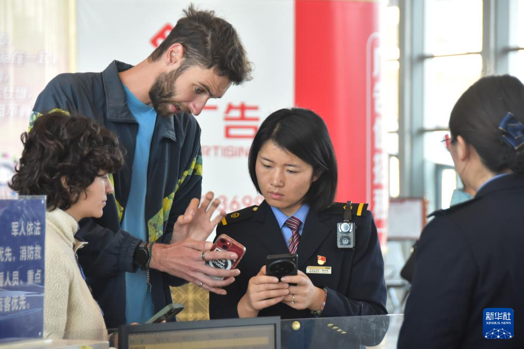 2月16日,在云南红河站,铁路工作人员龚岸敏(右二)为旅客提供咨询服务。