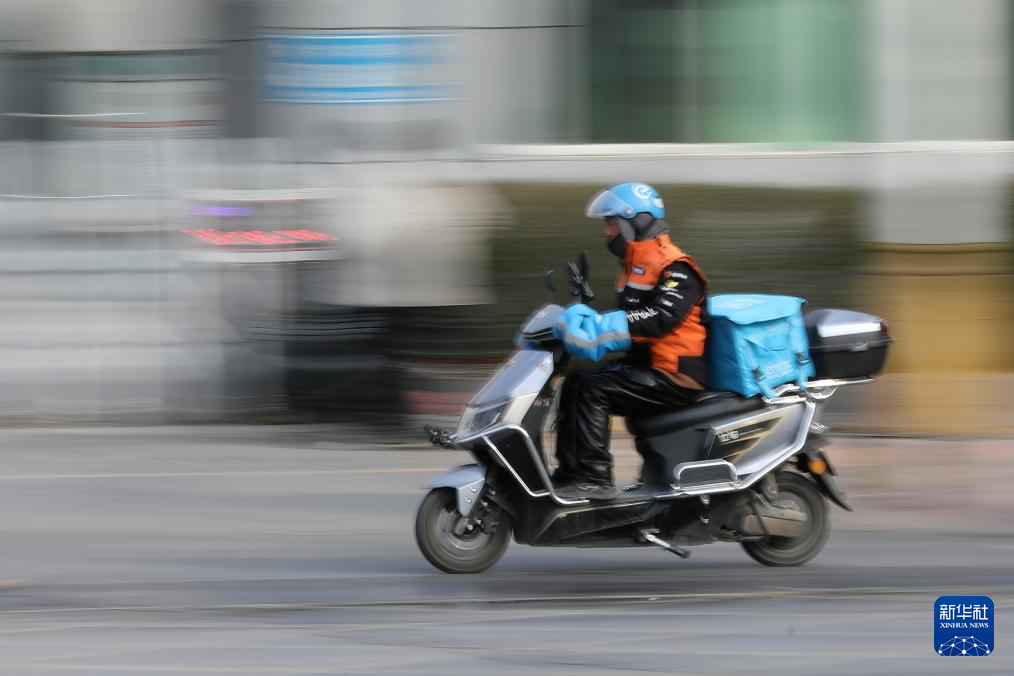 2月16日,一名外卖员在河南焦作市温县街头骑行,为顾客送餐。