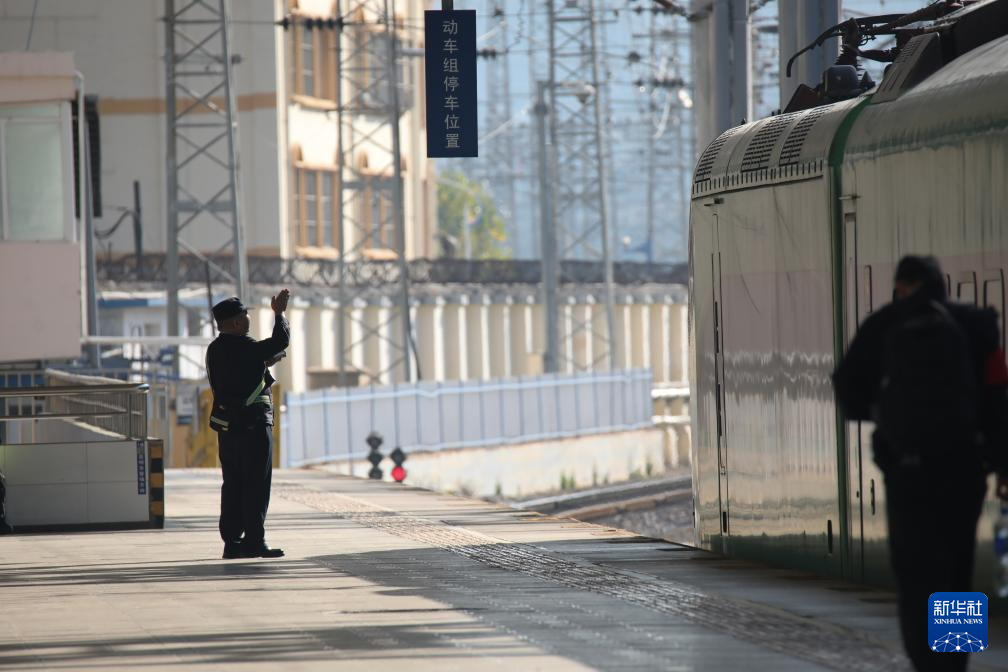 2月16日,在昆明站,中铁昆明局集团的职工进行发车前的例行检查。
