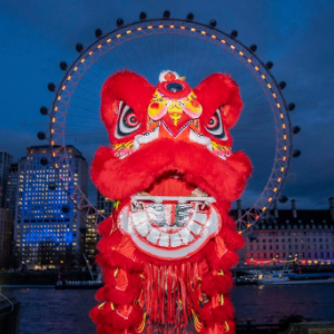 2月16日晚,在英国首都伦敦,演员在亮起红色灯光的“伦敦眼”前表演舞狮。