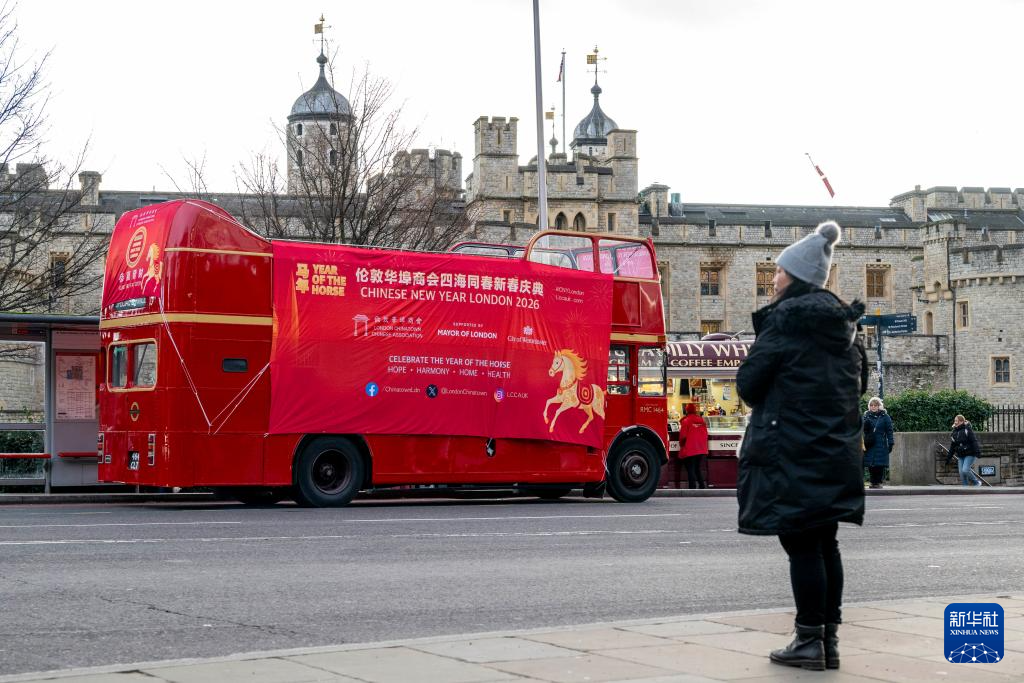 2月16日,在英国伦敦,马年新春主题红色双层巴士驶过伦敦塔。