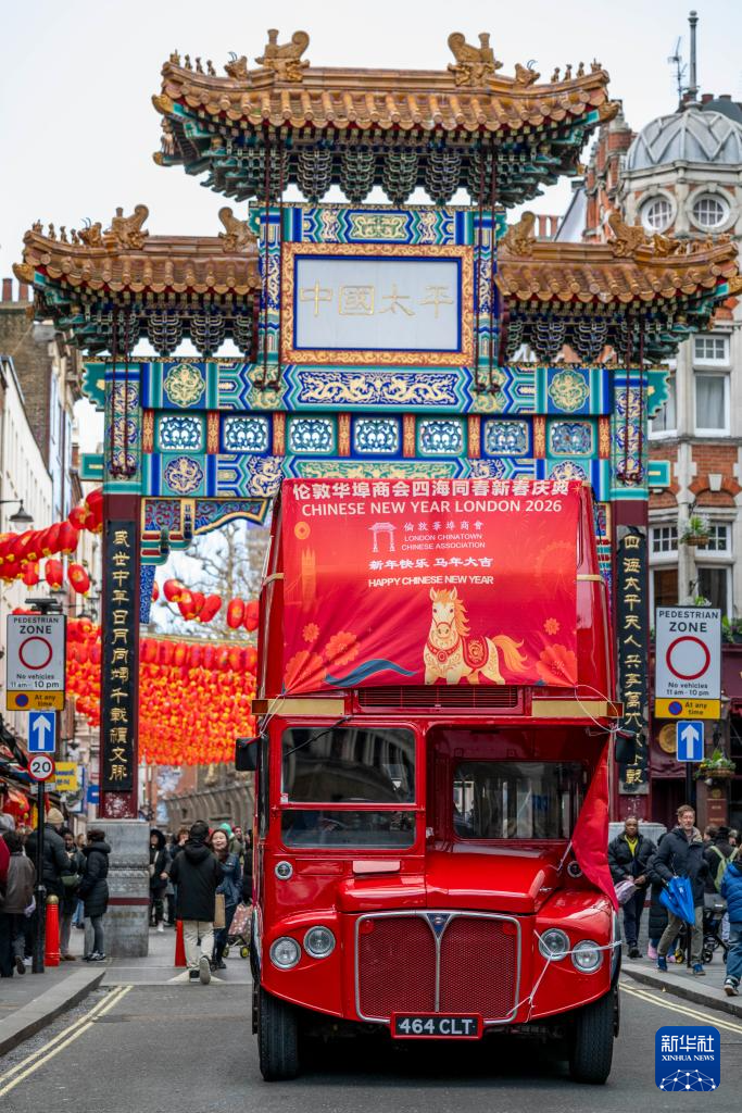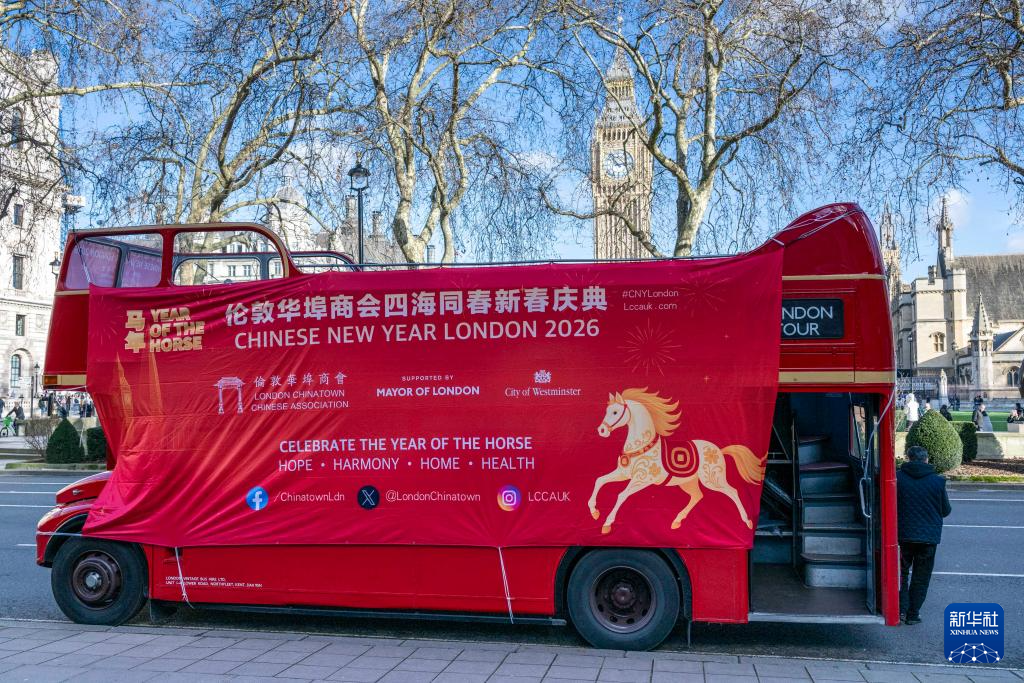 当日,装饰着马年新春主题元素的红色双层巴士穿梭于英国伦敦大街小巷,迎接中国农历新年的到来。