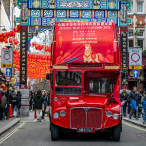 2月16日,马年新春主题红色双层巴士行驶在英国伦敦中国城。