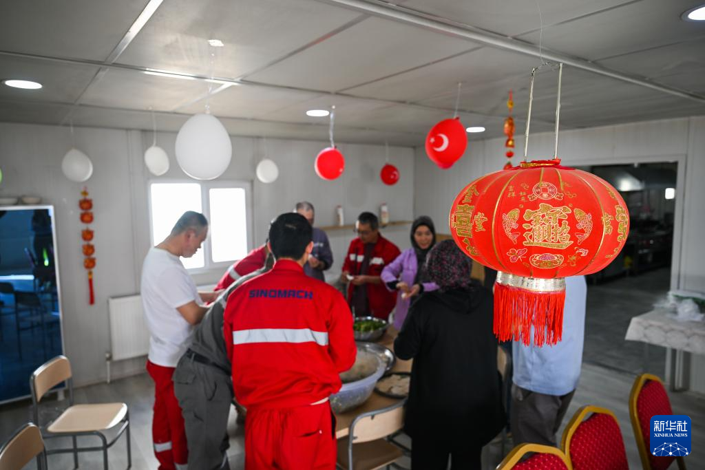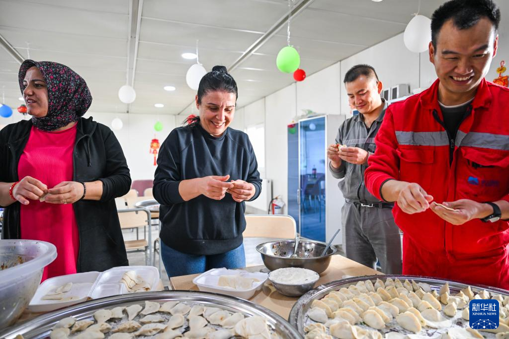 2月16日,在土耳其阿克萨拉伊省图兹湖地下天然气储库扩建项目二期工程营地,中土两国职工在一起包饺子。