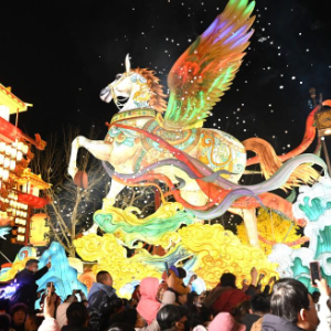 2月18日晚,游客在湖北省宣恩县城观赏彩灯“骏马”凌空飞腾。