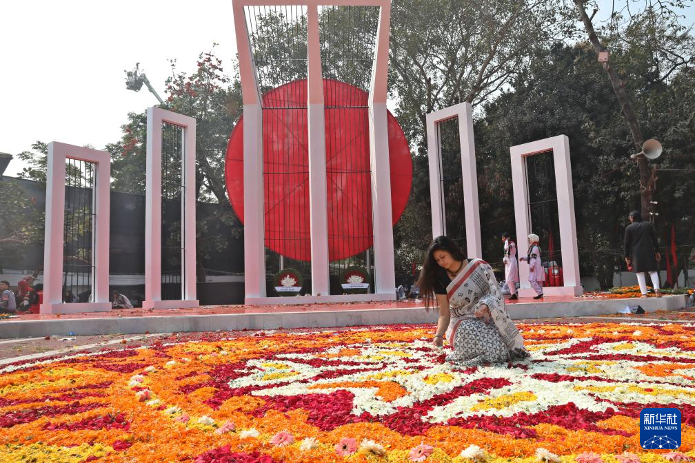 2月21日,在孟加拉国首都达卡的语言烈士纪念碑前,人们参加国际母语日纪念活动(无人机照片)。