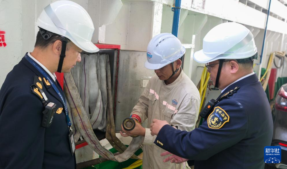 2月21日,在海南省海口市秀英港,海口海事局工作人员在客滚船上进行检查。