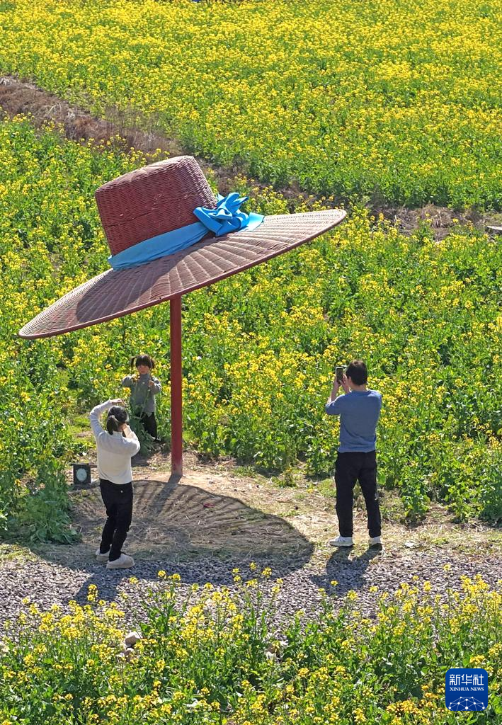 2月21日,游人在浙江省温岭市松门镇松建村欣赏绽放的油菜花。