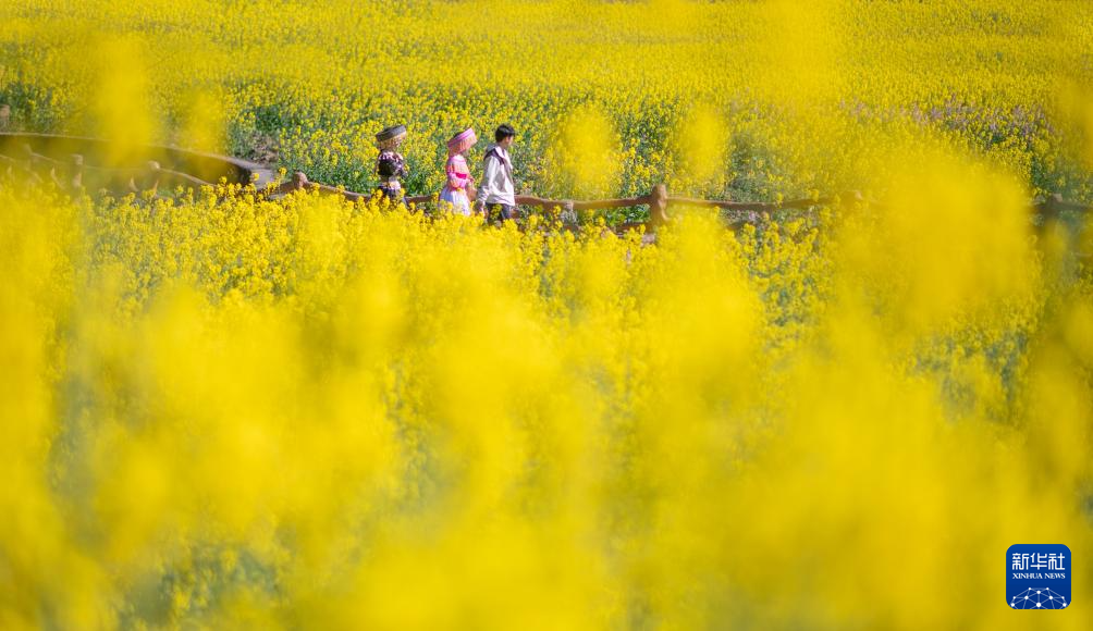 2月22日,在云南省文山壮族苗族自治州马关县夹寒箐镇上布高村,游人在油菜花海中感受春光。
