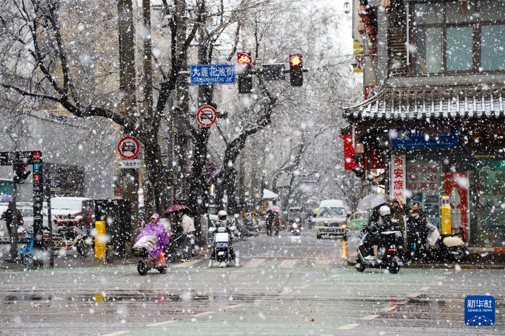 2月23日,在陕西省西安市街头,市民冒雪出行。