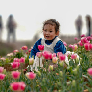 2月26日,一名小朋友在滇池边一处郁金香花丛旁拍照。
