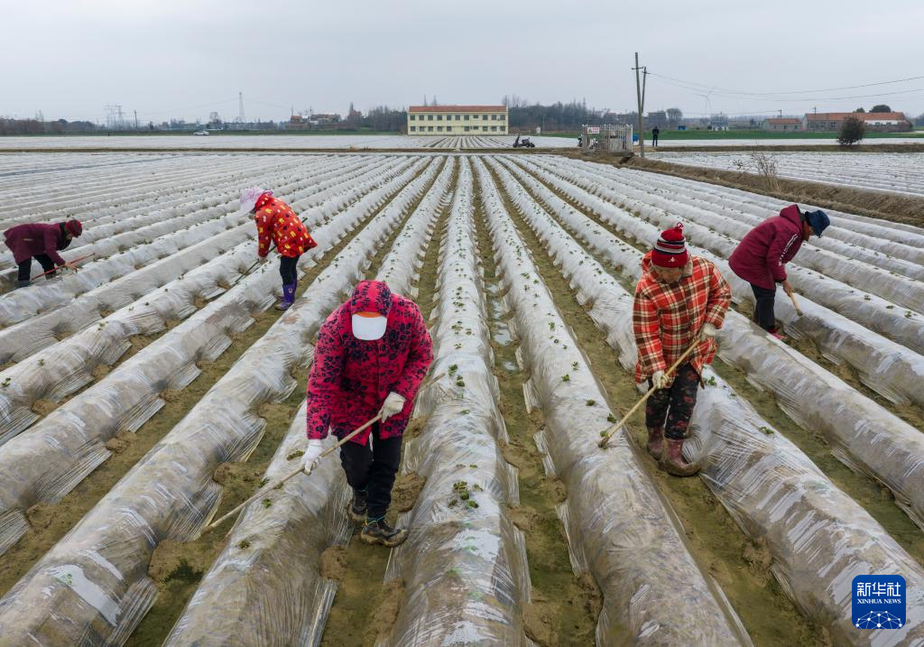 2月24日,湖北省孝感市云梦县隔蒲潭镇新马村村民在田间给土豆破苗松土(无人机照片)。