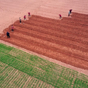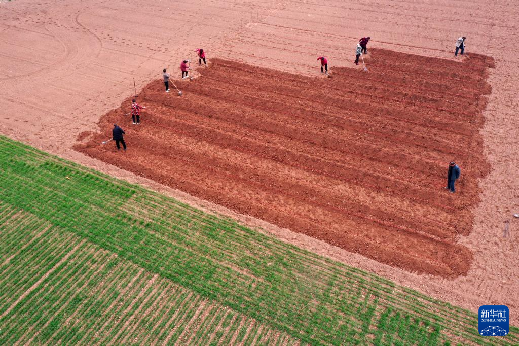 2月25日,河南省沁阳市王曲乡东王曲村,农民在田间整地作畦(无人机照片)。
