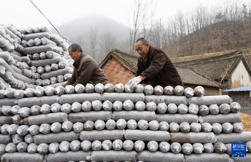 2月25日,河南省洛阳市汝阳县王坪乡大庄村村民在搬运袋料香菇。