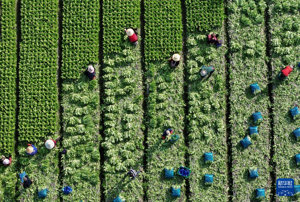 2月24日,农民在四川成都市彭州市九尺镇玉源社区的田地里采收油麦菜(无人机照片)。