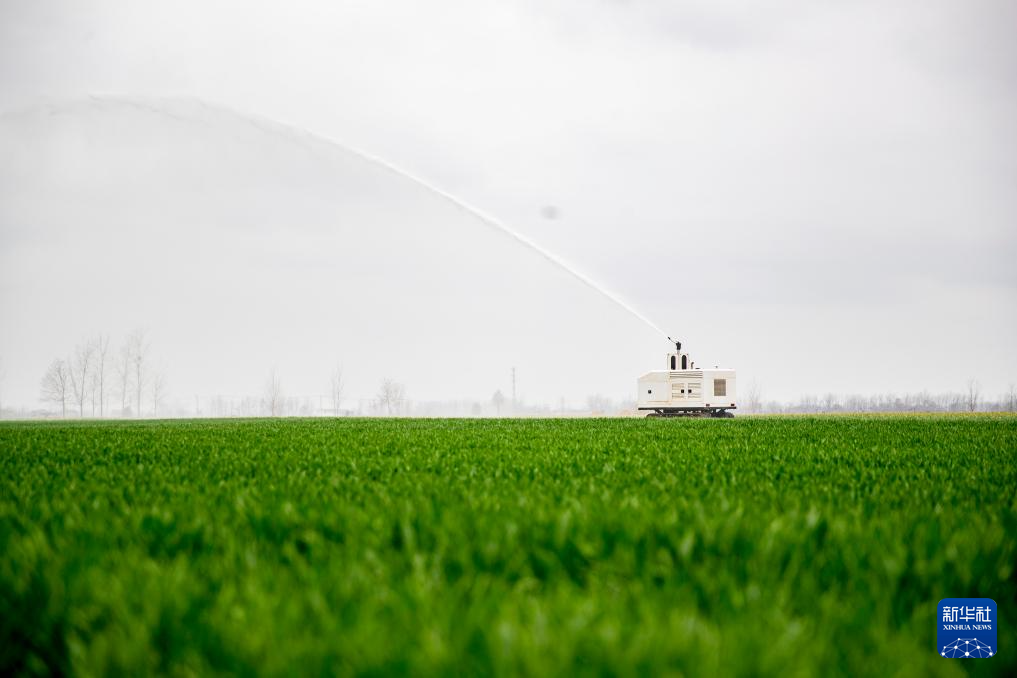 2月24日,在河南省商丘市睢县后台乡一处农田内,无人智能灌溉机器人进行水肥一体化喷灌作业。