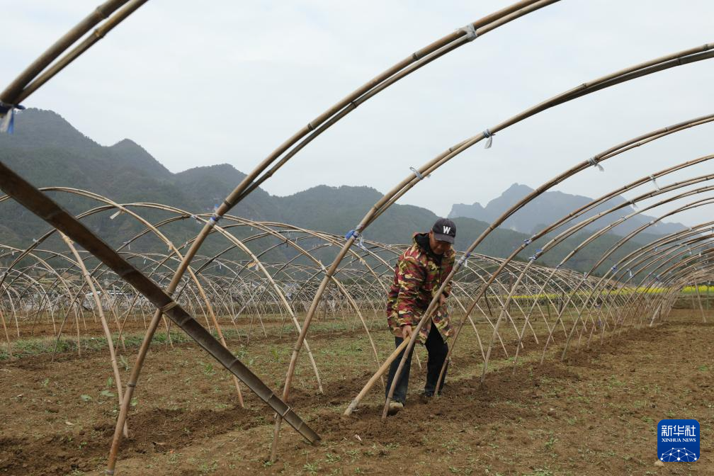 2月24日,在贵州省铜仁市江口县闵孝镇哨上社区,村民在整理西瓜种植大棚。
