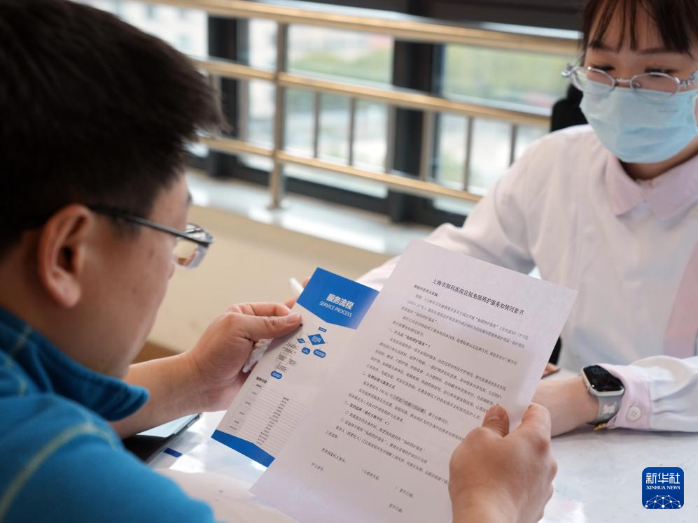 2月26日,在上海市肺科医院外科病区,患者家属在了解免陪照护服务的内容。