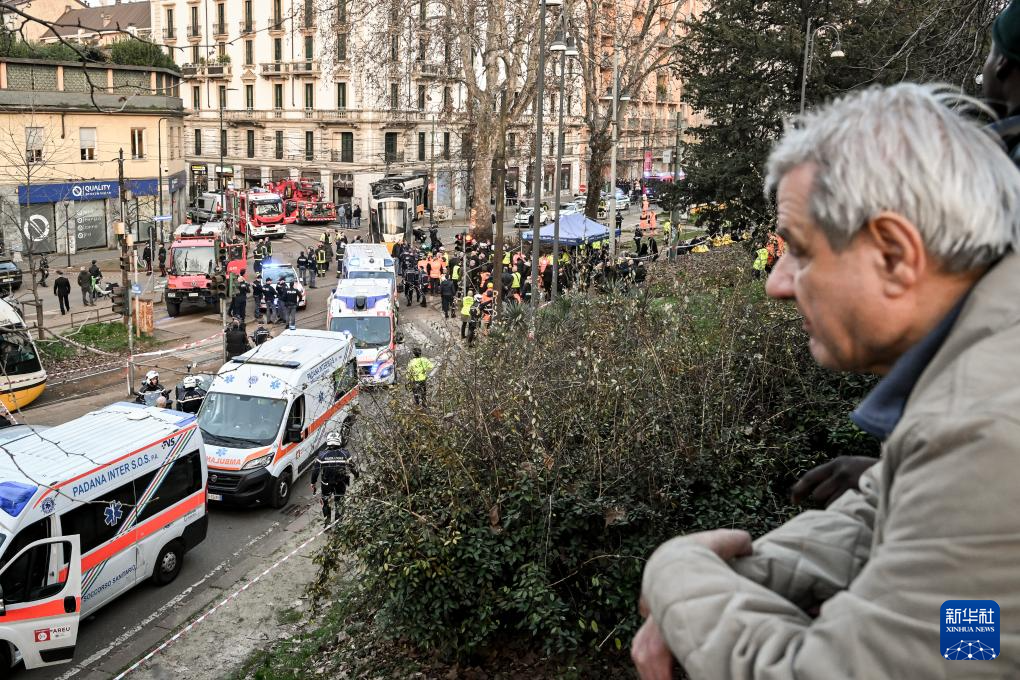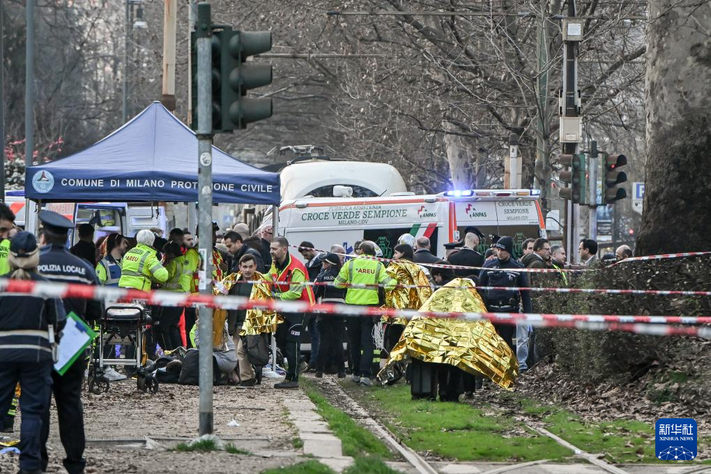 2月27日,医护人员在意大利米兰的有轨电车事故现场工作。