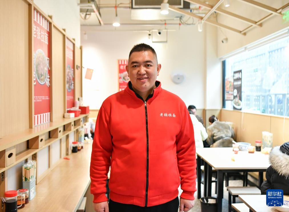 2月27日在位于北京市朝外街道的老张拉面馆拍摄的面馆老板成奶仓。