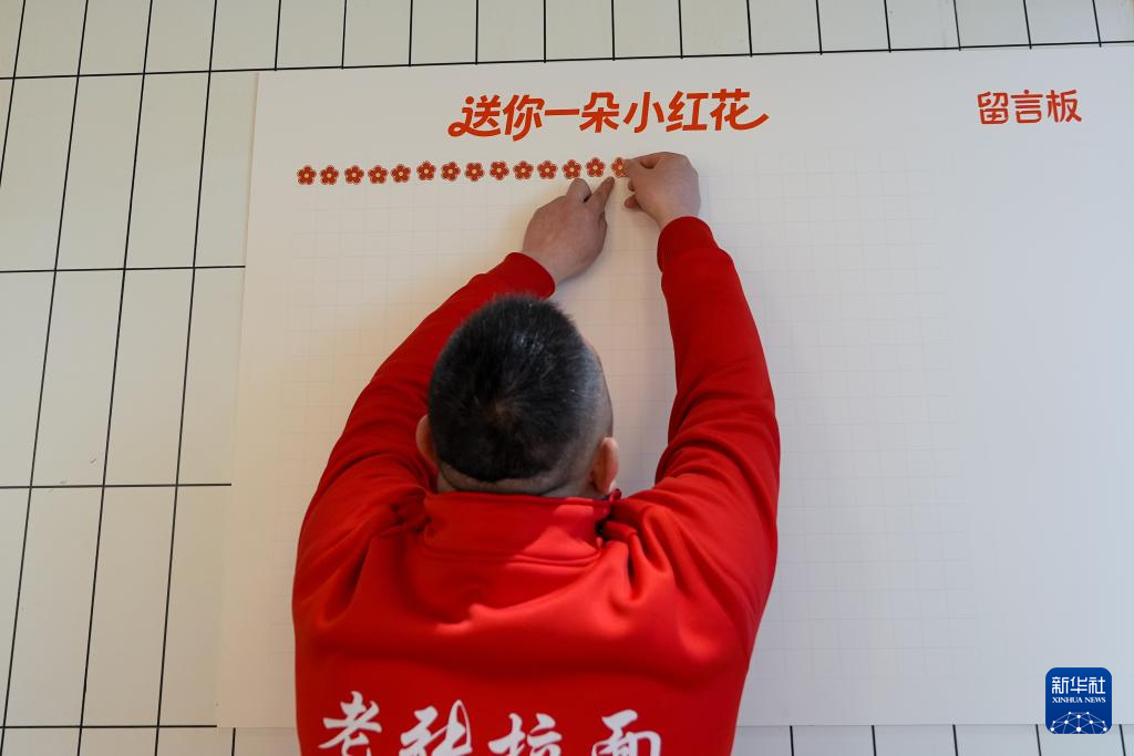 2月27日,在位于北京市朝外街道的老张拉面馆,成奶仓把一朵“小红花”贴在店里的小白板上,代表着发出去的“小红花”兑换了一碗面。